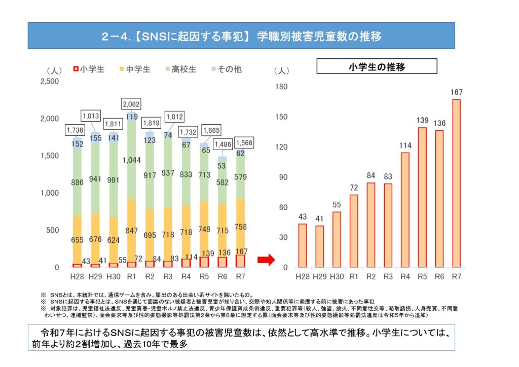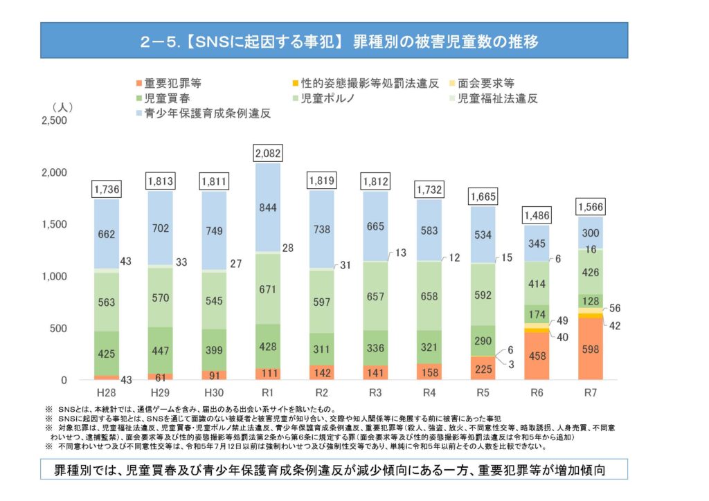 警察庁の発表によると、2025年にSNSをきっかけとして犯罪被害に遭った18歳未満の「子供」、「児童」※は1,566人に達し、前年から80人増加して減少傾向から再び増加へと転じました。