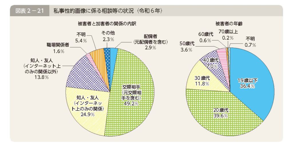 令和6年中の私事性的画像(注1)に関する相談等の件数(注2)は2,128件であった。このうち、被害者と加害者の関係については、交際相手(元交際相手を含む。)が49.2%、インターネット上のみの関係にある知人・友人が24.9%を占めており、また、被害者の年齢については、20歳代が39.6%、19歳以下が36.4%を占めている。