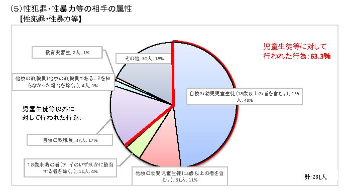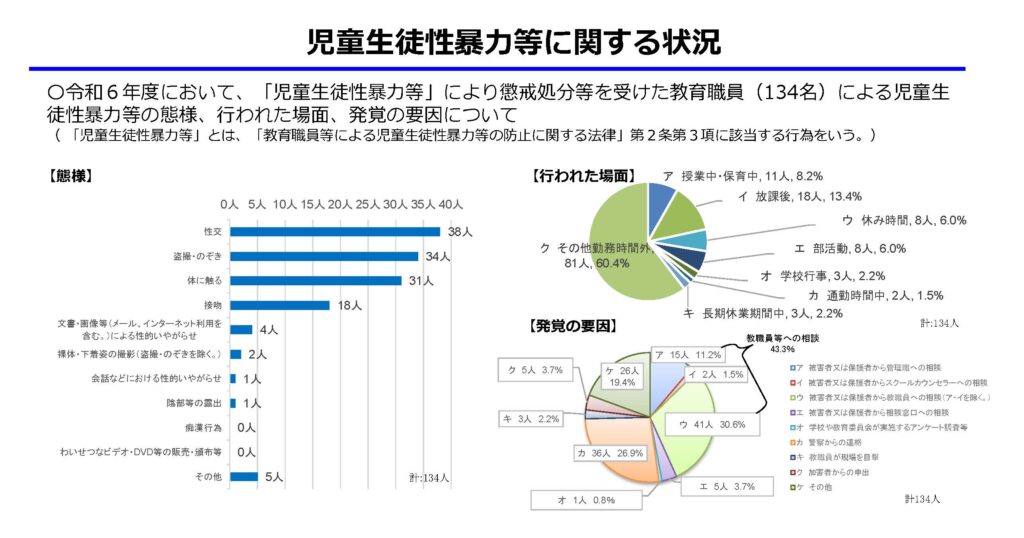 「性犯罪・性暴⼒等」により懲戒処分等を受けた281人の公立学校教員のうち、勤務校の児童生徒ら子どもへの性暴力による処分者は134人。内容は「性行」が38人で最多。以下、「盗撮・のぞき」(34人)、「体に触る」(31人)が続きます。