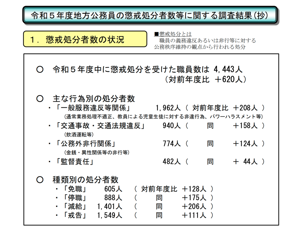 令和5年度中に懲戒処分を受けた地方公務員(職員数)は4,443人で、前年度に比べて620人増加しています。
