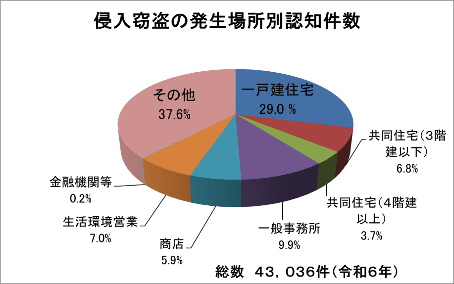 侵入窃盗の発生場所別認知件数は、一戸建住宅が29%と最も多く、一般事務所が9.9%で生活環境営業が7%と続いています。