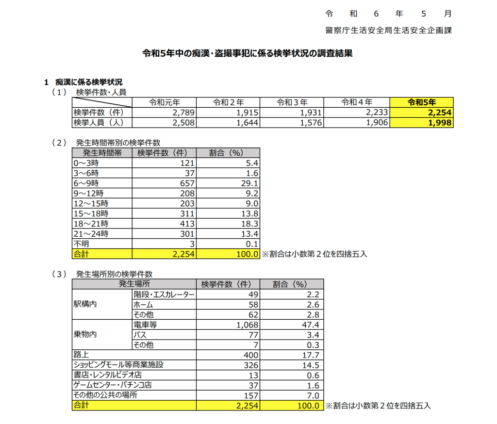 警察庁の統計によると、令和5年中の痴漢に係る検挙件数は、2,254件です。
