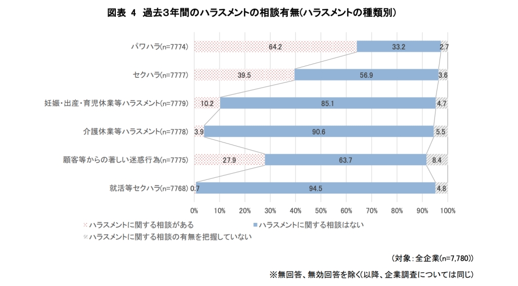 「過去 3 年間に各ハラスメントの相談があった」と回答した企業の割合をみると、上からパワハラ(64.2%)、セクハラ(39.5%)、顧客等からの著しい迷惑行為(27.9%)、妊娠・出産・育児休業等ハラスメント(10.2%)、介護休業等ハラスメント(3.9%)、就活等セクハラ(0.7%)となっています。