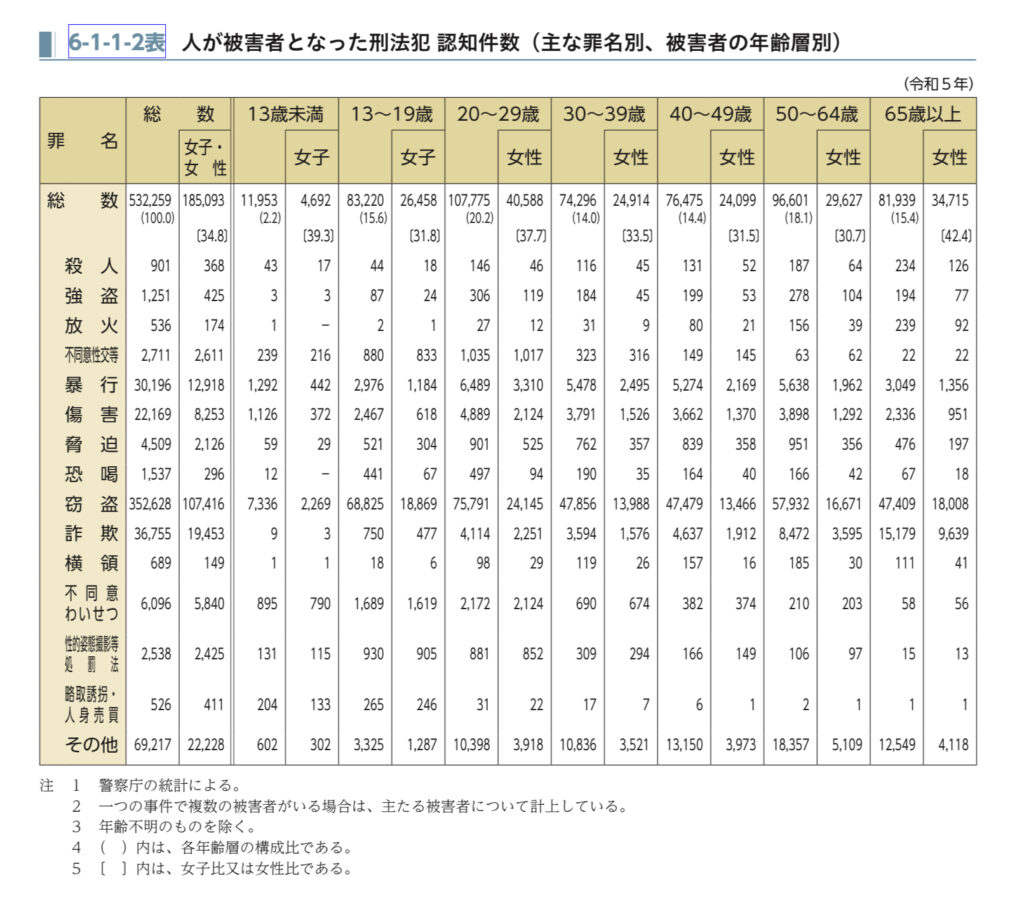 法務省公表の「令和6年版犯罪白書」によれば、令和5年度調査における「人が被害者となった刑法犯 認知件数」の総数は532,259件であり、女性は185,093件となっています。