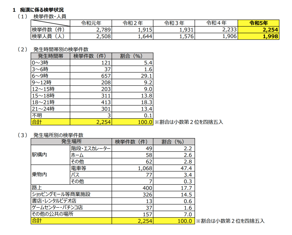 警察庁の統計によると、令和5年中の痴漢に係る検挙件数は、2,254件です。