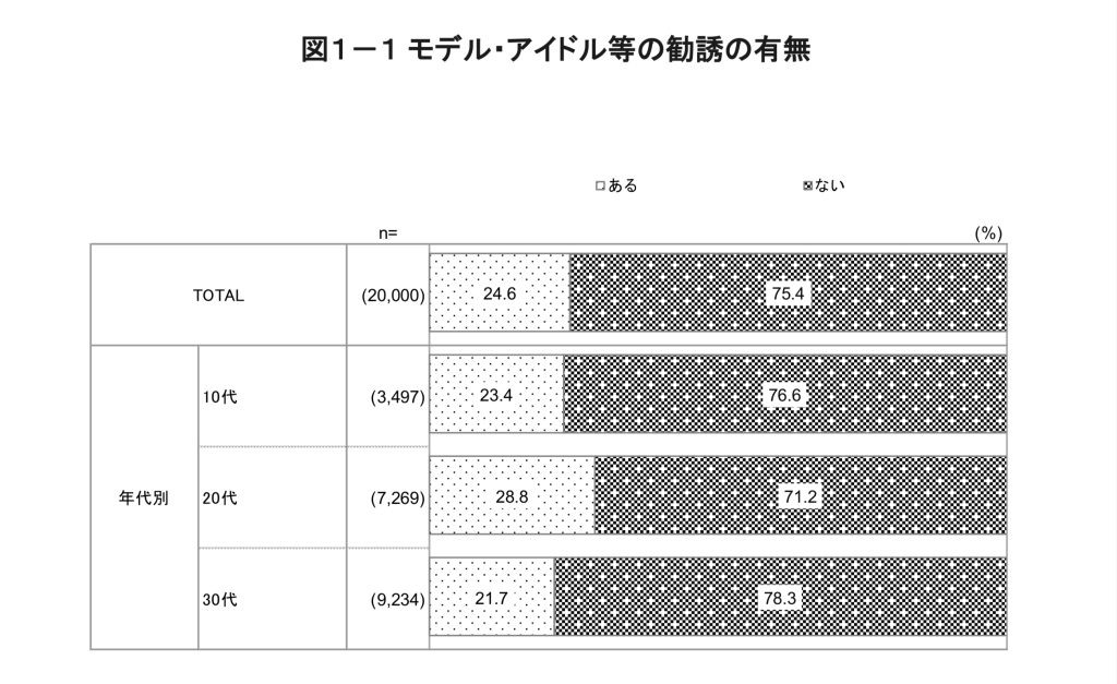 内閣府男女共同参画局の調査によると、15歳〜39歳まで(※中学生を除く)の女性を対象として行ったインターネット調査(2020年)で、「モデルやアイドルにならないか」などの勧誘を受けた経験がある人は、24.6%でした。