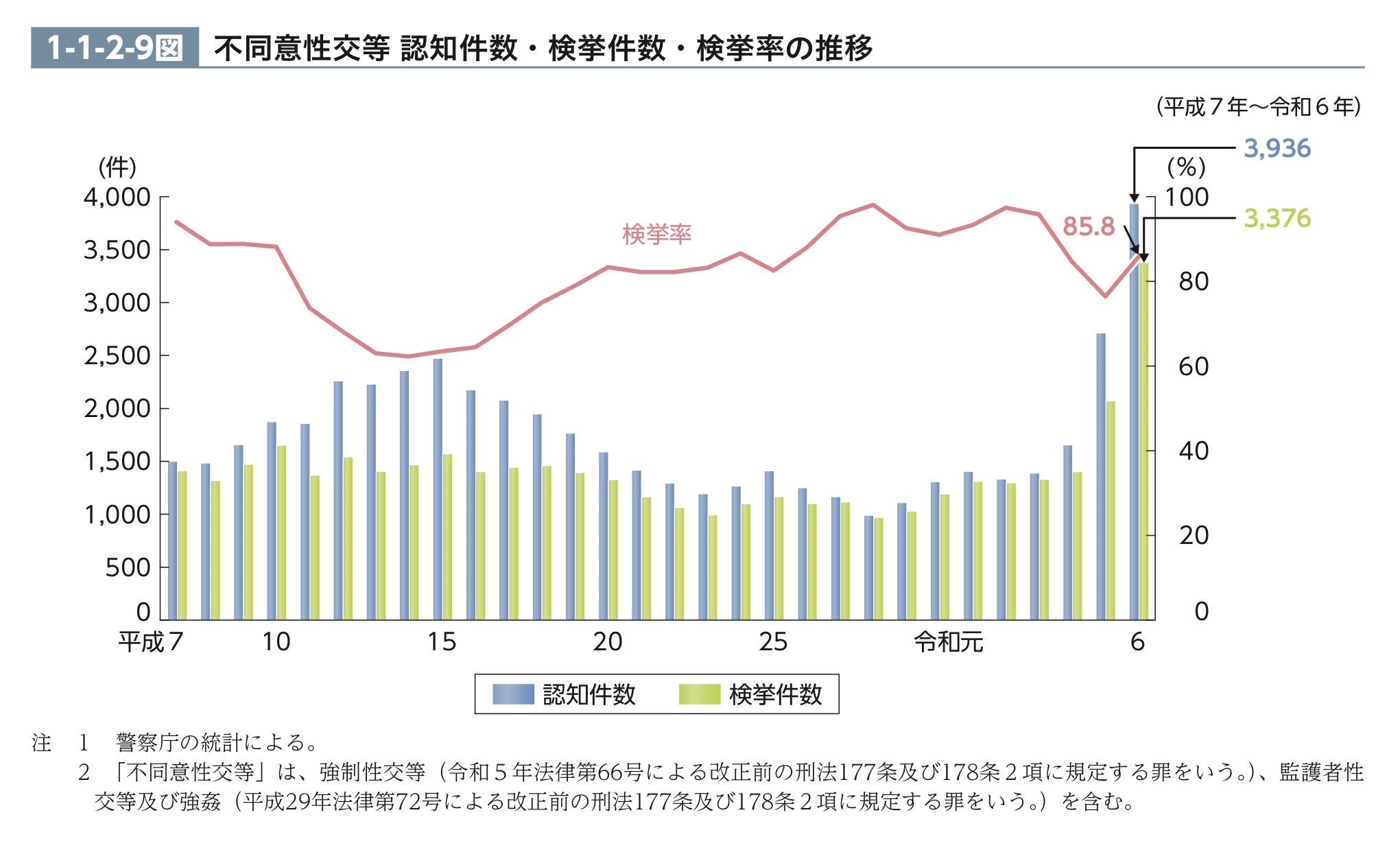令和6年の「不同意性交等」の認知件数は3,936件。うち女性を被害者とするものは3,780件
